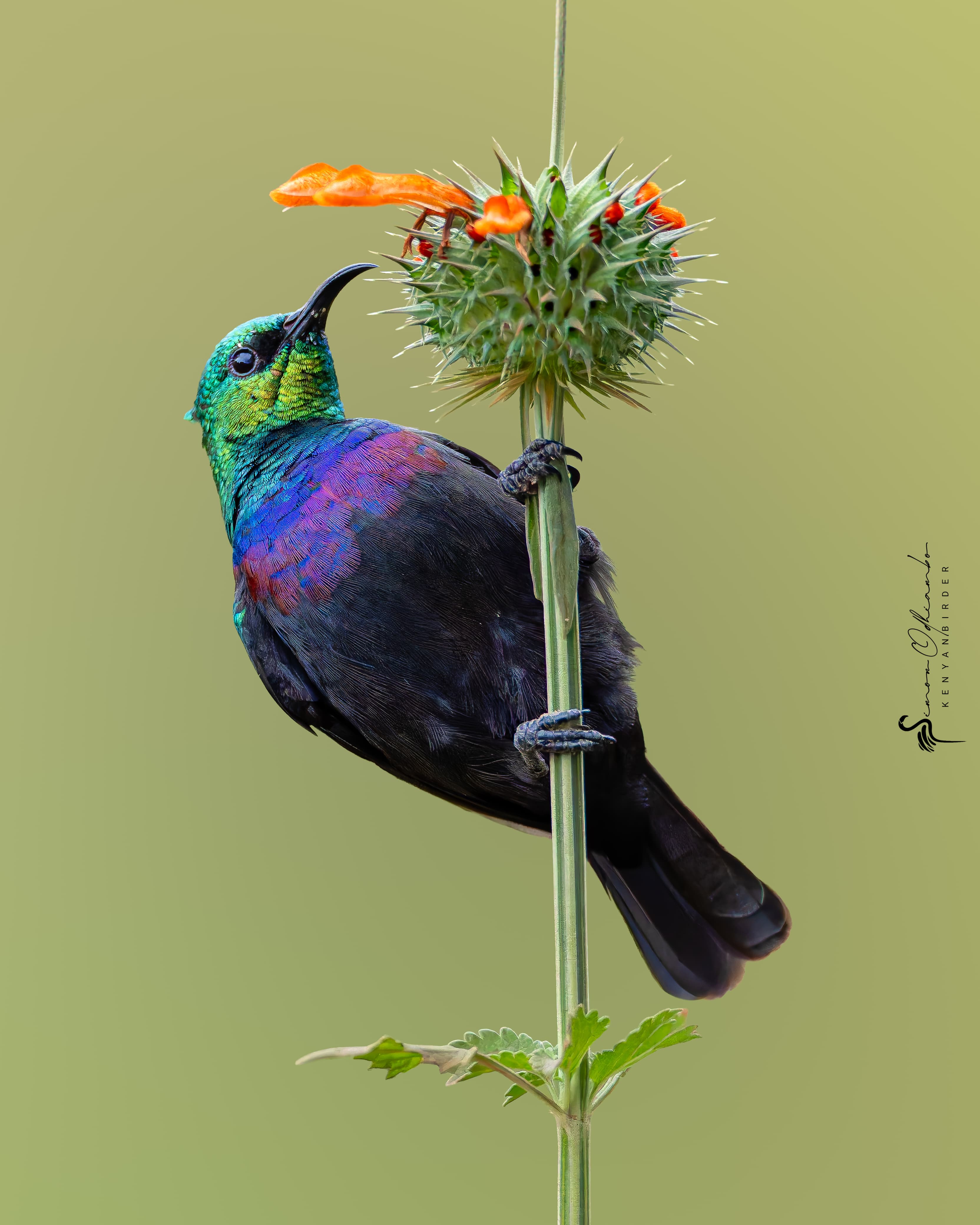 bird clings to a thornbranch, eyeing a cluster of orange blooms. With a sudden lunge—snap! he beheads a flower, tossing it aside
